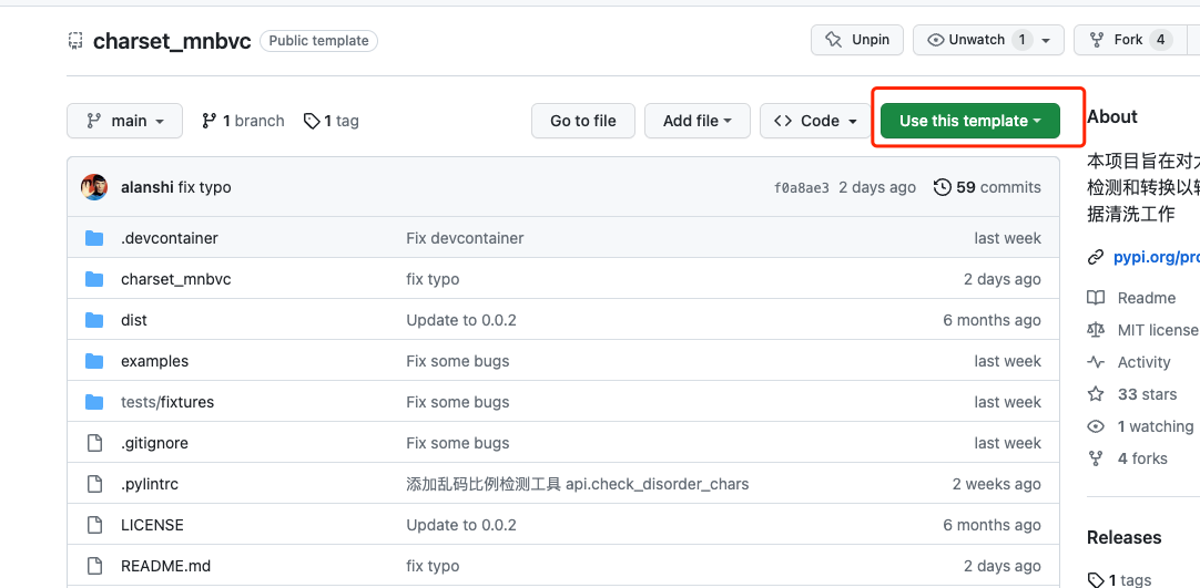 第二步: 在项目主页点击“Use this template”按钮